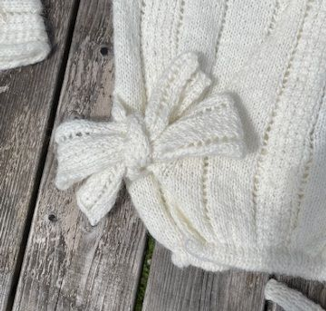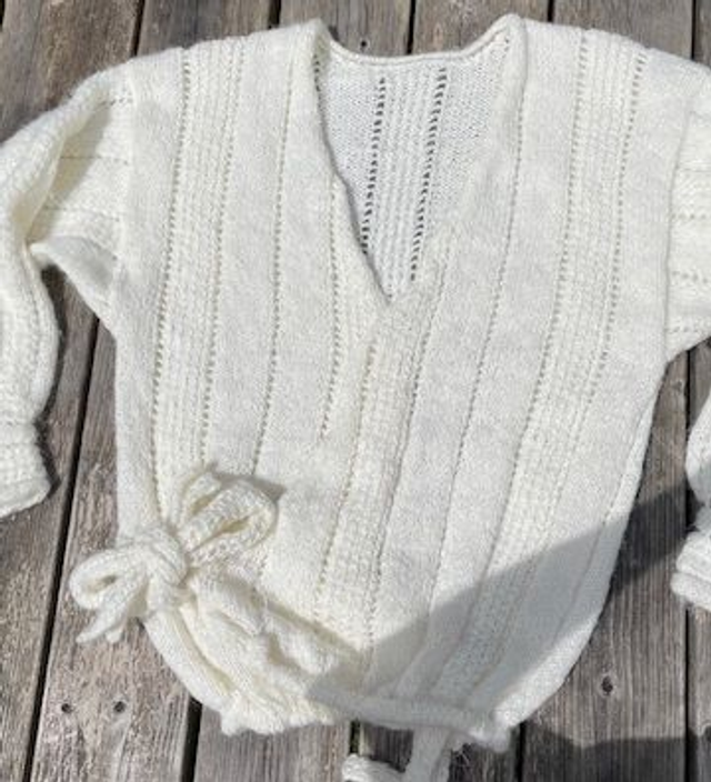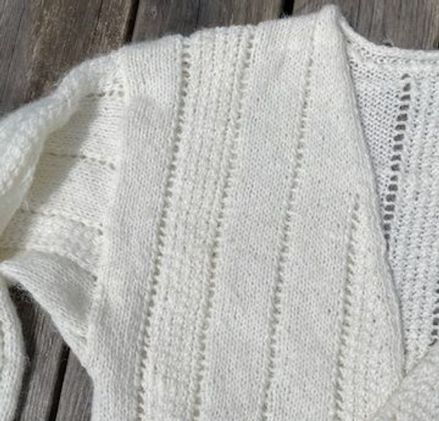 Se travaille de bas en haut, devants et dos en une fois avec aiguilles circulaire en aller-retour, les manches séparément,